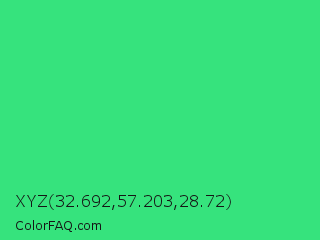 XYZ 32.692,57.203,28.72 Color is a normal green color and the nearest color is UFO Green #3cd070. Hex code #36e37d and RGB value is rgb(54,227,125). In RGB color space, this color is composed of 21% red, 89% green, 49% blue, In CMYK color space, this color is composed of 76% cyan, 0% magenta, 45% yellow , 11% black , In HSL color space, this color has a hue angle of 145° , 76% saturation and 55% lightness.