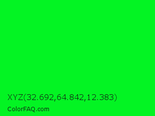 XYZ 32.692,64.842,12.383 Color is a normal green color and the nearest color is Green #00ff00. Hex code #03f423 and RGB value is rgb(3,244,35). In RGB color space, this color is composed of 1% red, 96% green, 14% blue, In CMYK color space, this color is composed of 99% cyan, 0% magenta, 86% yellow , 4% black , In HSL color space, this color has a hue angle of 128° , 98% saturation and 48% lightness.