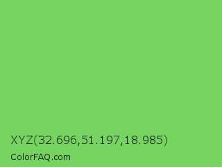 XYZ 32.696,51.197,18.985 Color is a normal green color and the nearest color is Mantis #74c365. Hex code #75d35f and RGB value is rgb(117,211,95). In RGB color space, this color is composed of 46% red, 83% green, 37% blue, In CMYK color space, this color is composed of 45% cyan, 0% magenta, 55% yellow , 17% black , In HSL color space, this color has a hue angle of 109° , 57% saturation and 60% lightness.