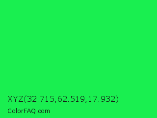 XYZ 32.715,62.519,17.932 Color is a normal green color and the nearest color is Malachite #0bda51. Hex code #19ef50 and RGB value is rgb(25,239,80). In RGB color space, this color is composed of 10% red, 94% green, 31% blue, In CMYK color space, this color is composed of 90% cyan, 0% magenta, 67% yellow , 6% black , In HSL color space, this color has a hue angle of 135° , 87% saturation and 52% lightness.