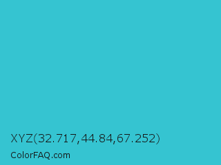 XYZ 32.717,44.84,67.252 Color is a normal cyan color and the nearest color is Scooter #2ebfd4. Hex code #35c4d1 and RGB value is rgb(53,196,209). In RGB color space, this color is composed of 21% red, 77% green, 82% blue, In CMYK color space, this color is composed of 75% cyan, 6% magenta, 0% yellow , 18% black , In HSL color space, this color has a hue angle of 185° , 63% saturation and 51% lightness.