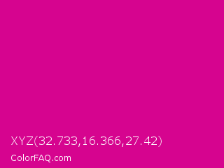 XYZ 32.733,16.366,27.42 Color is a normal magenta color and the nearest color is Mexican Pink #e4007c. Hex code #d6048f and RGB value is rgb(214,4,143). In RGB color space, this color is composed of 84% red, 2% green, 56% blue, In CMYK color space, this color is composed of 0% cyan, 98% magenta, 33% yellow , 16% black , In HSL color space, this color has a hue angle of 320° , 96% saturation and 43% lightness.