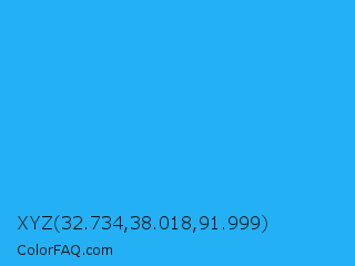 XYZ 32.734,38.018,91.999 Color is a normal blue color and the nearest color is Button Blue #24a0ed. Hex code #24b0f5 and RGB value is rgb(36,176,245). In RGB color space, this color is composed of 14% red, 69% green, 96% blue, In CMYK color space, this color is composed of 85% cyan, 28% magenta, 0% yellow , 4% black , In HSL color space, this color has a hue angle of 200° , 91% saturation and 55% lightness.