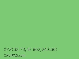 XYZ 32.73,47.862,24.036 Color is a light green color and the nearest color is Mantis #74c365. Hex code #7dca74 and RGB value is rgb(125,202,116). In RGB color space, this color is composed of 49% red, 79% green, 45% blue, In CMYK color space, this color is composed of 38% cyan, 0% magenta, 43% yellow , 21% black , In HSL color space, this color has a hue angle of 114° , 45% saturation and 62% lightness.