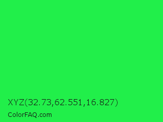 XYZ 32.73,62.551,16.827 Color is a normal green color and the nearest color is Malachite #0bda51. Hex code #21ef4a and RGB value is rgb(33,239,74). In RGB color space, this color is composed of 13% red, 94% green, 29% blue, In CMYK color space, this color is composed of 86% cyan, 0% magenta, 69% yellow , 6% black , In HSL color space, this color has a hue angle of 132° , 87% saturation and 53% lightness.