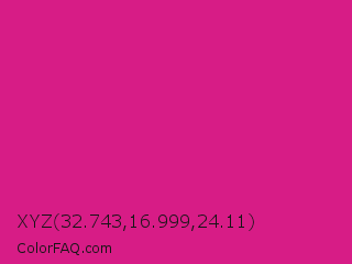 XYZ 32.743,16.999,24.11 Color is a normal magenta color and the nearest color is Vivid Cerise #da1d81. Hex code #d71c86 and RGB value is rgb(215,28,134). In RGB color space, this color is composed of 84% red, 11% green, 53% blue, In CMYK color space, this color is composed of 0% cyan, 87% magenta, 38% yellow , 16% black , In HSL color space, this color has a hue angle of 326° , 77% saturation and 48% lightness.