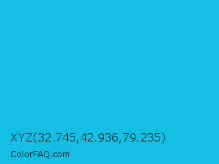 XYZ 32.745,42.936,79.235 Color is a normal cyan color and the nearest color is Cyan Process #00b7eb. Hex code #12bfe3 and RGB value is rgb(18,191,227). In RGB color space, this color is composed of 7% red, 75% green, 89% blue, In CMYK color space, this color is composed of 92% cyan, 16% magenta, 0% yellow , 11% black , In HSL color space, this color has a hue angle of 190° , 85% saturation and 48% lightness.
