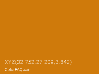 XYZ 32.752,27.209,3.842 Color is a normal orange color and the nearest color is Meteor #d07d12. Hex code #cf7a0b and RGB value is rgb(207,122,11). In RGB color space, this color is composed of 81% red, 48% green, 4% blue, In CMYK color space, this color is composed of 0% cyan, 41% magenta, 95% yellow , 19% black , In HSL color space, this color has a hue angle of 34° , 90% saturation and 43% lightness.