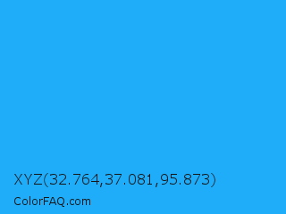 XYZ 32.764,37.081,95.873 Color is a normal blue color and the nearest color is Button Blue #24a0ed. Hex code #1fadfa and RGB value is rgb(31,173,250). In RGB color space, this color is composed of 12% red, 68% green, 98% blue, In CMYK color space, this color is composed of 88% cyan, 31% magenta, 0% yellow , 2% black , In HSL color space, this color has a hue angle of 201° , 96% saturation and 55% lightness.