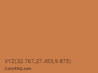 XYZ 32.767,27.453,9.875 Color is a normal orange color and the nearest color is Raw Sienna Crayola #d27d46. Hex code #ca7c49 and RGB value is rgb(202,124,73). In RGB color space, this color is composed of 79% red, 49% green, 29% blue, In CMYK color space, this color is composed of 0% cyan, 39% magenta, 64% yellow , 21% black , In HSL color space, this color has a hue angle of 24° , 55% saturation and 54% lightness.