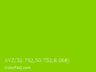 XYZ 32.792,50.752,8.068 Color is a normal green color and the nearest color is Sheen Green #8fd400. Hex code #87d100 and RGB value is rgb(135,209,0). In RGB color space, this color is composed of 53% red, 82% green, 0% blue, In CMYK color space, this color is composed of 35% cyan, 0% magenta, 100% yellow , 18% black , In HSL color space, this color has a hue angle of 81° , 100% saturation and 41% lightness.