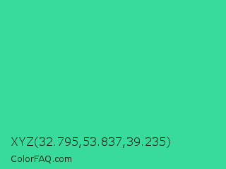 XYZ 32.795,53.837,39.235 Color is a normal green color and the nearest color is Shamrock #33cc99. Hex code #38db9a and RGB value is rgb(56,219,154). In RGB color space, this color is composed of 22% red, 86% green, 60% blue, In CMYK color space, this color is composed of 74% cyan, 0% magenta, 30% yellow , 14% black , In HSL color space, this color has a hue angle of 156° , 69% saturation and 54% lightness.
