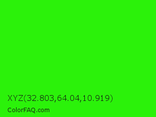 XYZ 32.803,64.04,10.919 Color is a normal green color and the nearest color is Neon Green #39ff14. Hex code #2bf20a and RGB value is rgb(43,242,10). In RGB color space, this color is composed of 17% red, 95% green, 4% blue, In CMYK color space, this color is composed of 82% cyan, 0% magenta, 96% yellow , 5% black , In HSL color space, this color has a hue angle of 111° , 92% saturation and 49% lightness.