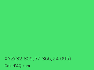 XYZ 32.809,57.366,24.095 Color is a normal green color and the nearest color is UFO Green #3cd070. Hex code #46e36e and RGB value is rgb(70,227,110). In RGB color space, this color is composed of 27% red, 89% green, 43% blue, In CMYK color space, this color is composed of 69% cyan, 0% magenta, 52% yellow , 11% black , In HSL color space, this color has a hue angle of 135° , 74% saturation and 58% lightness.