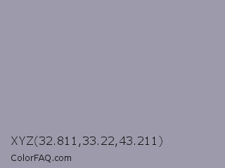 XYZ 32.811,33.22,43.211 Color is a light indigo color and the nearest color is Manatee #979aaa. Hex code #9d9aab and RGB value is rgb(157,154,171). In RGB color space, this color is composed of 62% red, 60% green, 67% blue, In CMYK color space, this color is composed of 8% cyan, 10% magenta, 0% yellow , 33% black , In HSL color space, this color has a hue angle of 251° , 9% saturation and 64% lightness.