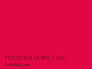XYZ 32.818,16.891,7.161 Color is a normal rose color and the nearest color is Red Ribbon #ed0a3f. Hex code #e30645 and RGB value is rgb(227,6,69). In RGB color space, this color is composed of 89% red, 2% green, 27% blue, In CMYK color space, this color is composed of 0% cyan, 97% magenta, 70% yellow , 11% black , In HSL color space, this color has a hue angle of 343° , 95% saturation and 46% lightness.