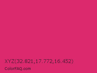 XYZ 32.821,17.772,16.452 Color is a normal rose color and the nearest color is Razzmatazz #e3256b. Hex code #db296e and RGB value is rgb(219,41,110). In RGB color space, this color is composed of 86% red, 16% green, 43% blue, In CMYK color space, this color is composed of 0% cyan, 81% magenta, 50% yellow , 14% black , In HSL color space, this color has a hue angle of 337° , 71% saturation and 51% lightness.