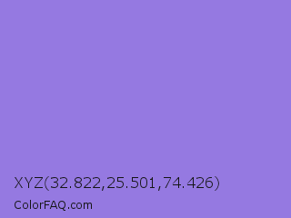 XYZ 32.822,25.501,74.426 Color is a light indigo color and the nearest color is Medium Purple #9370db. Hex code #9579e1 and RGB value is rgb(149,121,225). In RGB color space, this color is composed of 58% red, 47% green, 88% blue, In CMYK color space, this color is composed of 34% cyan, 46% magenta, 0% yellow , 12% black , In HSL color space, this color has a hue angle of 256° , 63% saturation and 68% lightness.