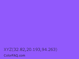 XYZ 32.82,20.193,94.263 Color is a light violet color and the nearest color is Navy Purple #9457eb. Hex code #9159fc and RGB value is rgb(145,89,252). In RGB color space, this color is composed of 57% red, 35% green, 99% blue, In CMYK color space, this color is composed of 42% cyan, 65% magenta, 0% yellow , 1% black , In HSL color space, this color has a hue angle of 261° , 96% saturation and 67% lightness.