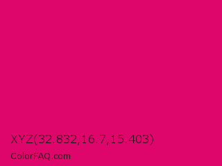 XYZ 32.832,16.7,15.403 Color is a normal rose color and the nearest color is Red Purple #e40078. Hex code #de056b and RGB value is rgb(222,5,107). In RGB color space, this color is composed of 87% red, 2% green, 42% blue, In CMYK color space, this color is composed of 0% cyan, 98% magenta, 52% yellow , 13% black , In HSL color space, this color has a hue angle of 332° , 96% saturation and 45% lightness.