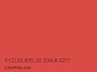 XYZ 32.835,20.534,8.027 Color is a normal red color and the nearest color is English Vermillion #cc474b. Hex code #db4b46 and RGB value is rgb(219,75,70). In RGB color space, this color is composed of 86% red, 29% green, 27% blue, In CMYK color space, this color is composed of 0% cyan, 66% magenta, 68% yellow , 14% black , In HSL color space, this color has a hue angle of 2° , 67% saturation and 57% lightness.