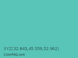 XYZ 32.843,45.559,52.962 Color is a normal cyan color and the nearest color is Fountain Blue #56b4be. Hex code #59c5b9 and RGB value is rgb(89,197,185). In RGB color space, this color is composed of 35% red, 77% green, 73% blue, In CMYK color space, this color is composed of 55% cyan, 0% magenta, 6% yellow , 23% black , In HSL color space, this color has a hue angle of 173° , 48% saturation and 56% lightness.