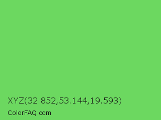XYZ 32.852,53.144,19.593 Color is a light green color and the nearest color is Mantis #74c365. Hex code #6cd860 and RGB value is rgb(108,216,96). In RGB color space, this color is composed of 42% red, 85% green, 38% blue, In CMYK color space, this color is composed of 50% cyan, 0% magenta, 56% yellow , 15% black , In HSL color space, this color has a hue angle of 114° , 61% saturation and 61% lightness.