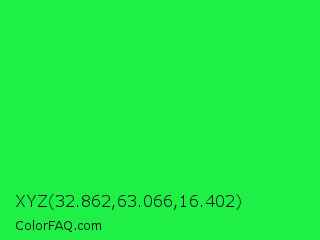 XYZ 32.862,63.066,16.402 Color is a normal green color and the nearest color is Malachite #0bda51. Hex code #1ff047 and RGB value is rgb(31,240,71). In RGB color space, this color is composed of 12% red, 94% green, 28% blue, In CMYK color space, this color is composed of 87% cyan, 0% magenta, 70% yellow , 6% black , In HSL color space, this color has a hue angle of 131° , 87% saturation and 53% lightness.
