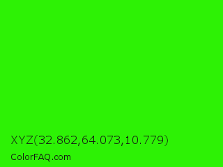 XYZ 32.862,64.073,10.779 Color is a normal green color and the nearest color is Harlequin #3fff00. Hex code #2df205 and RGB value is rgb(45,242,5). In RGB color space, this color is composed of 18% red, 95% green, 2% blue, In CMYK color space, this color is composed of 81% cyan, 0% magenta, 98% yellow , 5% black , In HSL color space, this color has a hue angle of 110° , 96% saturation and 48% lightness.