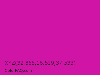 XYZ 32.865,16.519,37.533 Color is a normal magenta color and the nearest color is Royal Fuchsia #ca2c92. Hex code #cf14a6 and RGB value is rgb(207,20,166). In RGB color space, this color is composed of 81% red, 8% green, 65% blue, In CMYK color space, this color is composed of 0% cyan, 90% magenta, 20% yellow , 19% black , In HSL color space, this color has a hue angle of 313° , 82% saturation and 45% lightness.