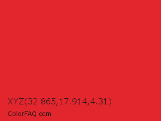 XYZ 32.865,17.914,4.31 Color is a normal red color and the nearest color is Permanent Geranium Lake #e12c2c. Hex code #e3262e and RGB value is rgb(227,38,46). In RGB color space, this color is composed of 89% red, 15% green, 18% blue, In CMYK color space, this color is composed of 0% cyan, 83% magenta, 80% yellow , 11% black , In HSL color space, this color has a hue angle of 357° , 77% saturation and 52% lightness.