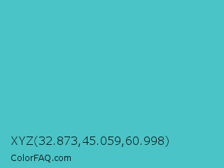 XYZ 32.873,45.059,60.998 Color is a normal cyan color and the nearest color is Sea Serpent #4bc7cf. Hex code #4ac4c7 and RGB value is rgb(74,196,199). In RGB color space, this color is composed of 29% red, 77% green, 78% blue, In CMYK color space, this color is composed of 63% cyan, 2% magenta, 0% yellow , 22% black , In HSL color space, this color has a hue angle of 181° , 53% saturation and 54% lightness.