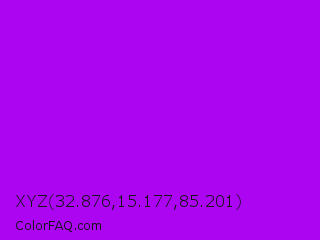 XYZ 32.876,15.177,85.201 Color is a normal purple color and the nearest color is Vivid Violet #9f00ff. Hex code #ab05f2 and RGB value is rgb(171,5,242). In RGB color space, this color is composed of 67% red, 2% green, 95% blue, In CMYK color space, this color is composed of 29% cyan, 98% magenta, 0% yellow , 5% black , In HSL color space, this color has a hue angle of 282° , 96% saturation and 48% lightness.