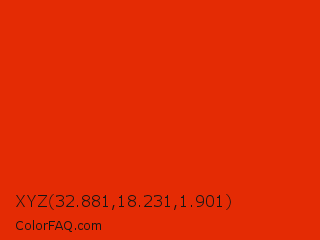 XYZ 32.881,18.231,1.901 Color is a normal red color and the nearest color is Ferrari Red #ff2800. Hex code #e42b04 and RGB value is rgb(228,43,4). In RGB color space, this color is composed of 89% red, 17% green, 2% blue, In CMYK color space, this color is composed of 0% cyan, 81% magenta, 98% yellow , 11% black , In HSL color space, this color has a hue angle of 10° , 97% saturation and 45% lightness.