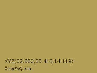 XYZ 32.882,35.413,14.119 Color is a normal yellow color and the nearest color is Husk #b7a458. Hex code #b3a057 and RGB value is rgb(179,160,87). In RGB color space, this color is composed of 70% red, 63% green, 34% blue, In CMYK color space, this color is composed of 0% cyan, 11% magenta, 51% yellow , 30% black , In HSL color space, this color has a hue angle of 48° , 38% saturation and 52% lightness.