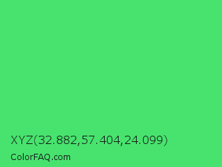XYZ 32.882,57.404,24.099 Color is a normal green color and the nearest color is UFO Green #3cd070. Hex code #47e36e and RGB value is rgb(71,227,110). In RGB color space, this color is composed of 28% red, 89% green, 43% blue, In CMYK color space, this color is composed of 69% cyan, 0% magenta, 52% yellow , 11% black , In HSL color space, this color has a hue angle of 135° , 74% saturation and 58% lightness.