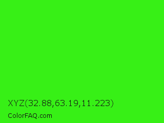 XYZ 32.88,63.19,11.223 Color is a normal green color and the nearest color is Neon Green #39ff14. Hex code #37f016 and RGB value is rgb(55,240,22). In RGB color space, this color is composed of 22% red, 94% green, 9% blue, In CMYK color space, this color is composed of 77% cyan, 0% magenta, 91% yellow , 6% black , In HSL color space, this color has a hue angle of 111° , 88% saturation and 51% lightness.