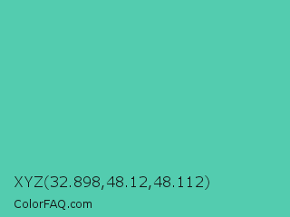 XYZ 32.898,48.12,48.112 Color is a normal cyan color and the nearest color is Eucalyptus #44d7a8. Hex code #53ccaf and RGB value is rgb(83,204,175). In RGB color space, this color is composed of 33% red, 80% green, 69% blue, In CMYK color space, this color is composed of 59% cyan, 0% magenta, 14% yellow , 20% black , In HSL color space, this color has a hue angle of 166° , 54% saturation and 56% lightness.