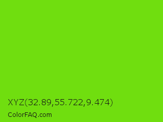 XYZ 32.89,55.722,9.474 Color is a normal green color and the nearest color is Alien Armpit #84de02. Hex code #70de0f and RGB value is rgb(112,222,15). In RGB color space, this color is composed of 44% red, 87% green, 6% blue, In CMYK color space, this color is composed of 50% cyan, 0% magenta, 93% yellow , 13% black , In HSL color space, this color has a hue angle of 92° , 87% saturation and 46% lightness.