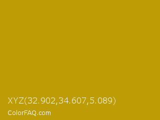 XYZ 32.902,34.607,5.089 Color is a normal yellow color and the nearest color is Buddha Gold #c1a004. Hex code #bd9c05 and RGB value is rgb(189,156,5). In RGB color space, this color is composed of 74% red, 61% green, 2% blue, In CMYK color space, this color is composed of 0% cyan, 17% magenta, 97% yellow , 26% black , In HSL color space, this color has a hue angle of 49° , 95% saturation and 38% lightness.