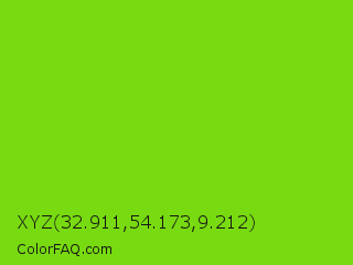 XYZ 32.911,54.173,9.212 Color is a normal green color and the nearest color is Alien Armpit #84de02. Hex code #78da10 and RGB value is rgb(120,218,16). In RGB color space, this color is composed of 47% red, 85% green, 6% blue, In CMYK color space, this color is composed of 45% cyan, 0% magenta, 93% yellow , 15% black , In HSL color space, this color has a hue angle of 89° , 86% saturation and 46% lightness.