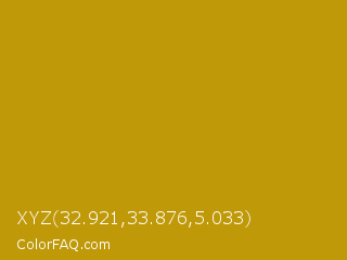 XYZ 32.921,33.876,5.033 Color is a normal yellow color and the nearest color is Buddha Gold #c1a004. Hex code #bf9908 and RGB value is rgb(191,153,8). In RGB color space, this color is composed of 75% red, 60% green, 3% blue, In CMYK color space, this color is composed of 0% cyan, 20% magenta, 96% yellow , 25% black , In HSL color space, this color has a hue angle of 48° , 92% saturation and 39% lightness.