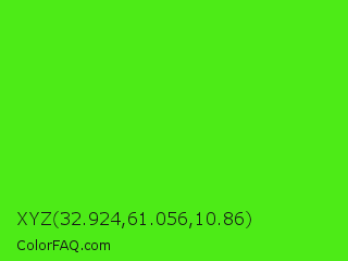 XYZ 32.924,61.056,10.86 Color is a normal green color and the nearest color is Neon Green #39ff14. Hex code #4deb17 and RGB value is rgb(77,235,23). In RGB color space, this color is composed of 30% red, 92% green, 9% blue, In CMYK color space, this color is composed of 67% cyan, 0% magenta, 90% yellow , 8% black , In HSL color space, this color has a hue angle of 105° , 84% saturation and 51% lightness.