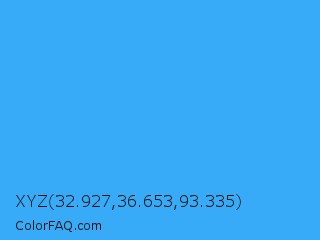 XYZ 32.927,36.653,93.335 Color is a normal blue color and the nearest color is Brilliant Azure #3399ff. Hex code #37abf7 and RGB value is rgb(55,171,247). In RGB color space, this color is composed of 22% red, 67% green, 97% blue, In CMYK color space, this color is composed of 78% cyan, 31% magenta, 0% yellow , 3% black , In HSL color space, this color has a hue angle of 204° , 92% saturation and 59% lightness.