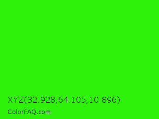 XYZ 32.928,64.105,10.896 Color is a normal green color and the nearest color is Neon Green #39ff14. Hex code #2ef209 and RGB value is rgb(46,242,9). In RGB color space, this color is composed of 18% red, 95% green, 4% blue, In CMYK color space, this color is composed of 81% cyan, 0% magenta, 96% yellow , 5% black , In HSL color space, this color has a hue angle of 110° , 93% saturation and 49% lightness.