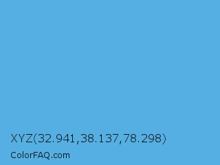 XYZ 32.941,38.137,78.298 Color is a light blue color and the nearest color is Blue Jeans #5dadec. Hex code #55afe3 and RGB value is rgb(85,175,227). In RGB color space, this color is composed of 33% red, 69% green, 89% blue, In CMYK color space, this color is composed of 63% cyan, 23% magenta, 0% yellow , 11% black , In HSL color space, this color has a hue angle of 202° , 72% saturation and 61% lightness.
