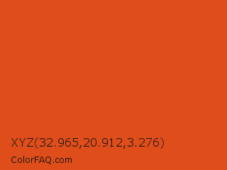 XYZ 32.965,20.912,3.276 Color is a normal orange color and the nearest color is Flame #e25822. Hex code #de4d1a and RGB value is rgb(222,77,26). In RGB color space, this color is composed of 87% red, 30% green, 10% blue, In CMYK color space, this color is composed of 0% cyan, 65% magenta, 88% yellow , 13% black , In HSL color space, this color has a hue angle of 16° , 79% saturation and 49% lightness.
