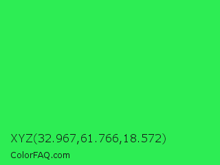 XYZ 32.967,61.766,18.572 Color is a normal green color and the nearest color is Malachite #0bda51. Hex code #2ded54 and RGB value is rgb(45,237,84). In RGB color space, this color is composed of 18% red, 93% green, 33% blue, In CMYK color space, this color is composed of 81% cyan, 0% magenta, 65% yellow , 7% black , In HSL color space, this color has a hue angle of 132° , 84% saturation and 55% lightness.