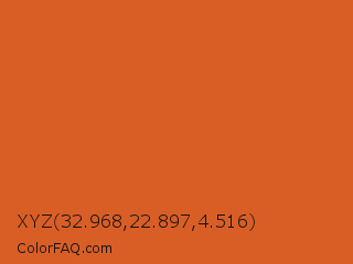 XYZ 32.968,22.897,4.516 Color is a normal orange color and the nearest color is Vivid Red Tangelo #df6124. Hex code #d95e26 and RGB value is rgb(217,94,38). In RGB color space, this color is composed of 85% red, 37% green, 15% blue, In CMYK color space, this color is composed of 0% cyan, 57% magenta, 82% yellow , 15% black , In HSL color space, this color has a hue angle of 19° , 70% saturation and 50% lightness.