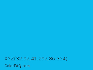 XYZ 32.97,41.297,86.354 Color is a normal cyan color and the nearest color is Cyan Process #00b7eb. Hex code #0abaed and RGB value is rgb(10,186,237). In RGB color space, this color is composed of 4% red, 73% green, 93% blue, In CMYK color space, this color is composed of 96% cyan, 22% magenta, 0% yellow , 7% black , In HSL color space, this color has a hue angle of 193° , 92% saturation and 48% lightness.